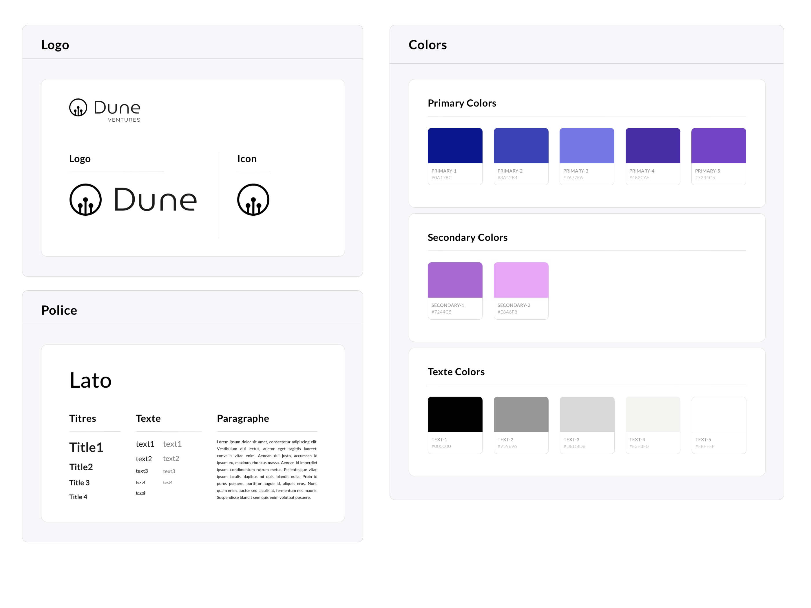 L’identité visuelle de Dune Ventures repose sur une charte graphique cohérente et distinctive, conçue pour incarner l’élégance, la clarté et l’esprit d’innovation qui nous animent.