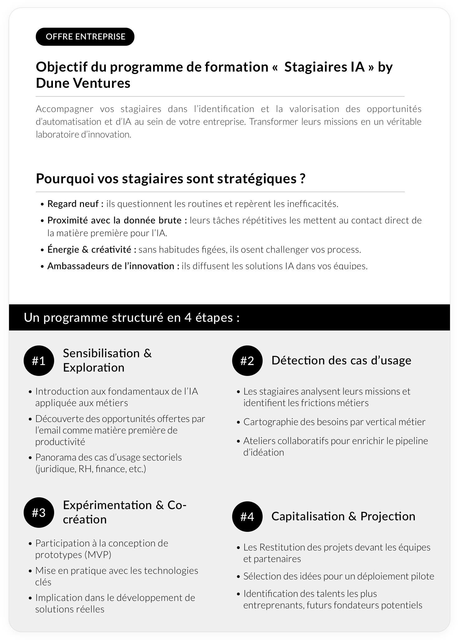 La formation « Stagiaires IA » by Dune Ventures a un objectif clair : faire de vos stagiaires — notamment au sein des équipes juridiques — un levier stratégique d’identification, d’expérimentation et de diffusion de l’intelligence artificielle dans l’entreprise. En les accompagnant pas à pas, nous transformons leurs missions quotidiennes en un véritable laboratoire d’innovation : détection des frictions métiers, qualification d’opportunités d’automatisation, co-création de premiers prototypes (MVP) et restitution opérationnelle pouvant déboucher sur des pilotes concrets. L’ambition n’est pas seulement pédagogique : il s’agit d’accélérer la productivité interne, de documenter des cas d’usage à forte valeur, puis de préparer le terrain à des déploiements ou, lorsque pertinent, à des co-créations de solutions avec Dune Ventures.