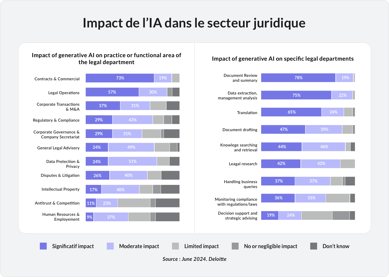 - Assistance à la rédaction : modèles de réponses, synthèses multi-sources, check-lists dynamiques, suggestions de clauses en fonction de la jurisprudence interne.